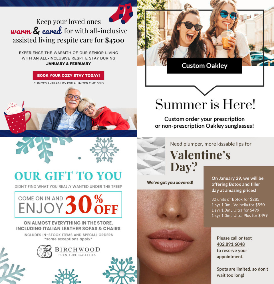 A collection of pop-ups, geofence advertisements, promotional banners, and printable assets.